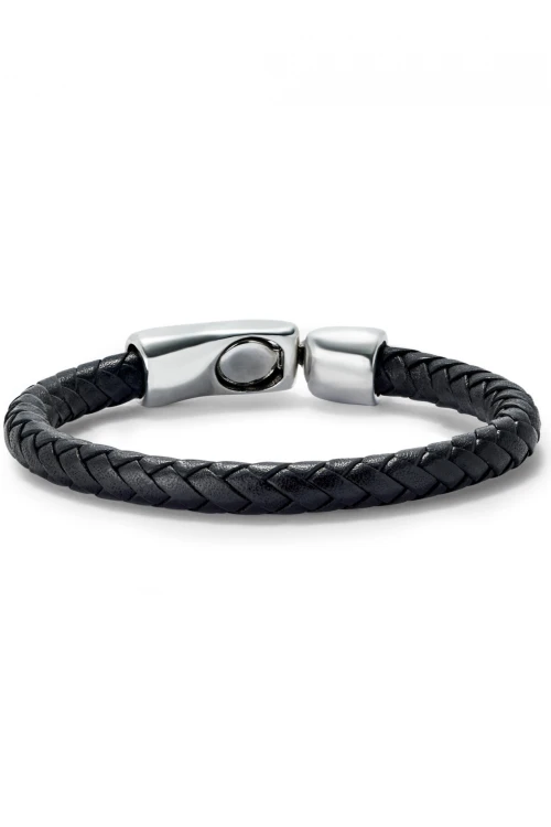 Pulsera cuero trenzada color negro con cierre bañada en plata de ley. Elaborado en España, en un proceso 100% artesanal. Colección de joyas genderless que combinan el cuero con piezas en forma de tubo, bañados en plata y de acabado orgánico. Descubre la colección ser natural.